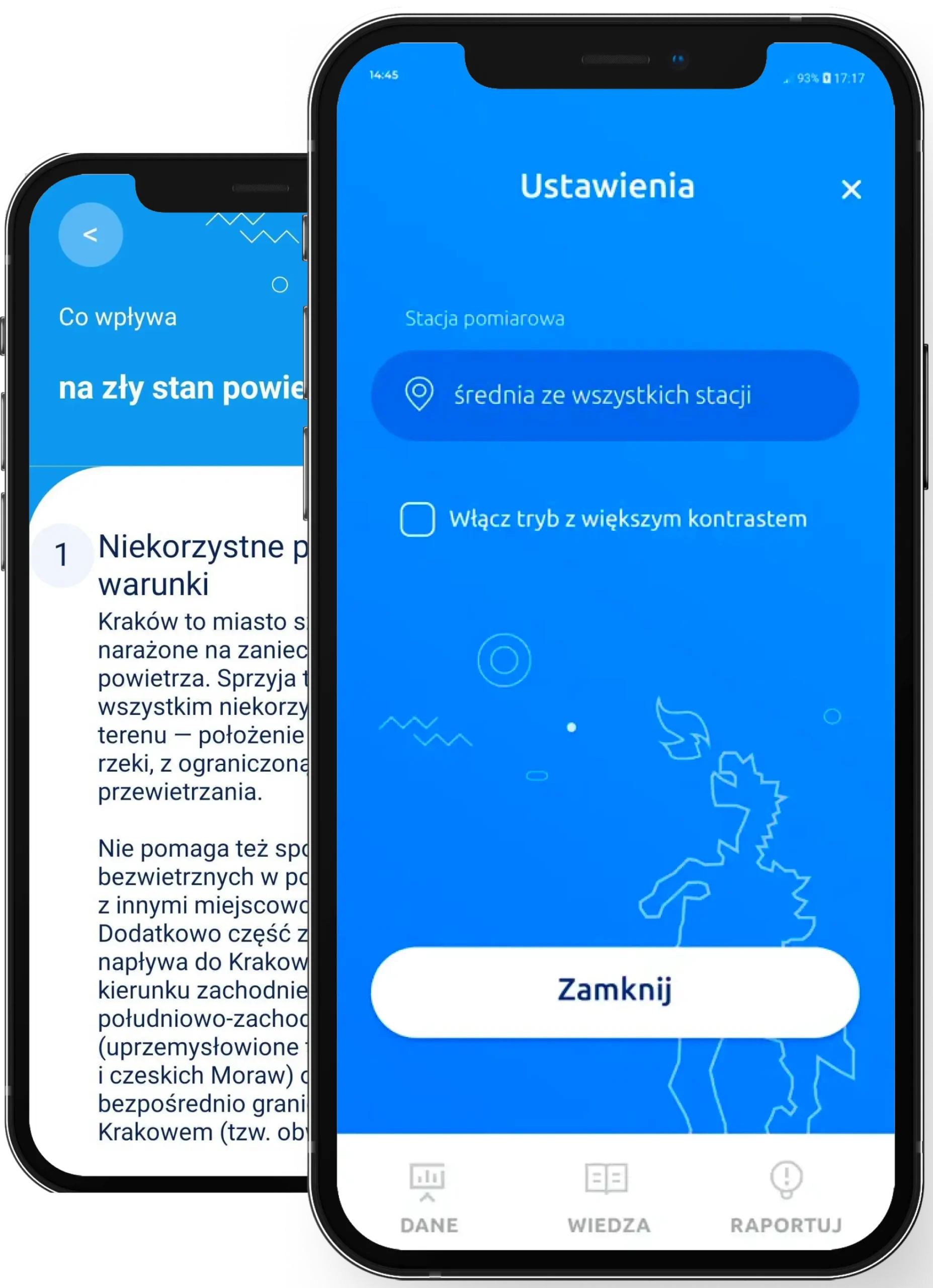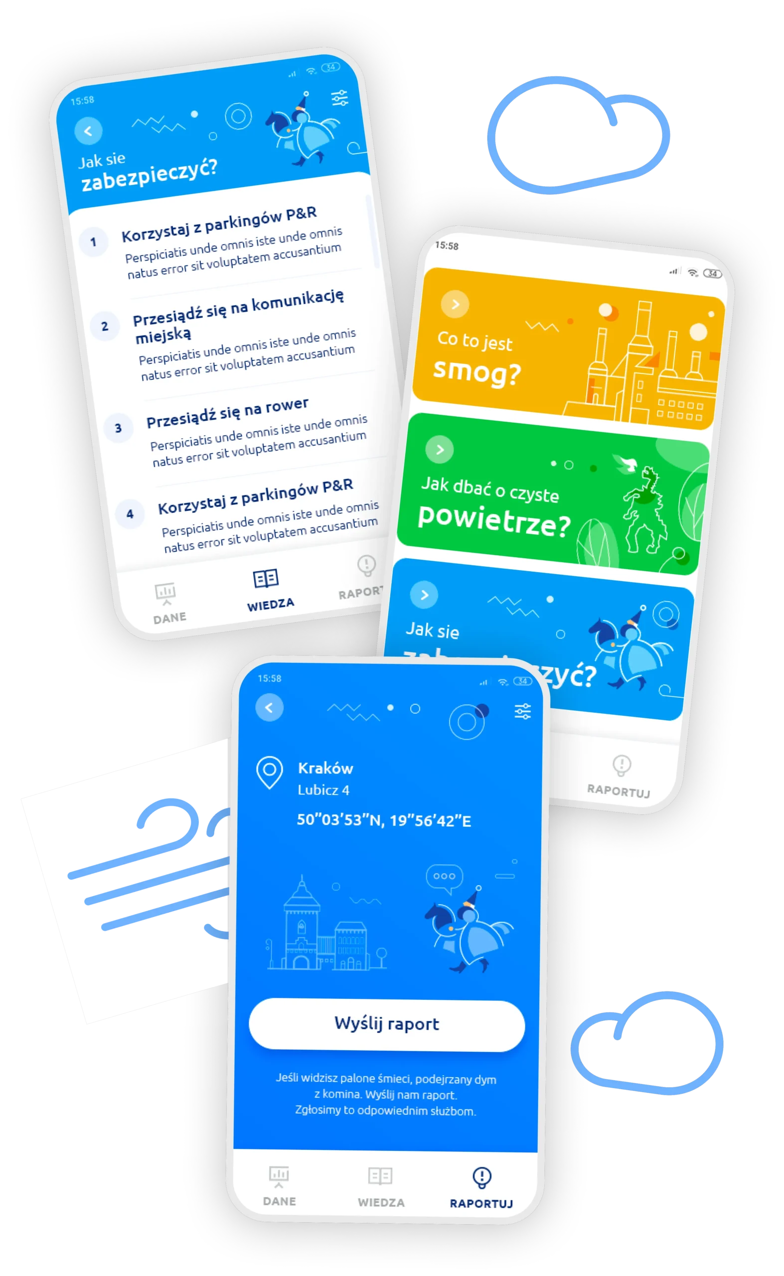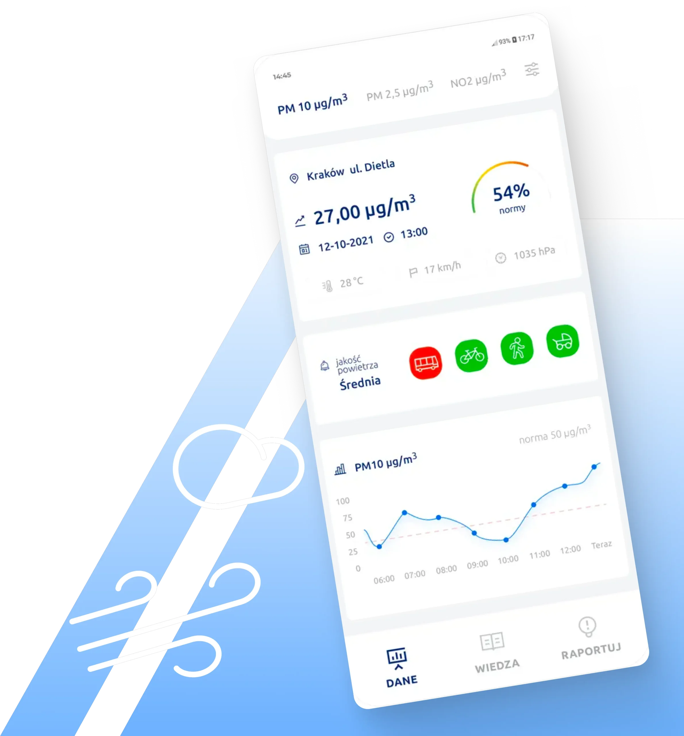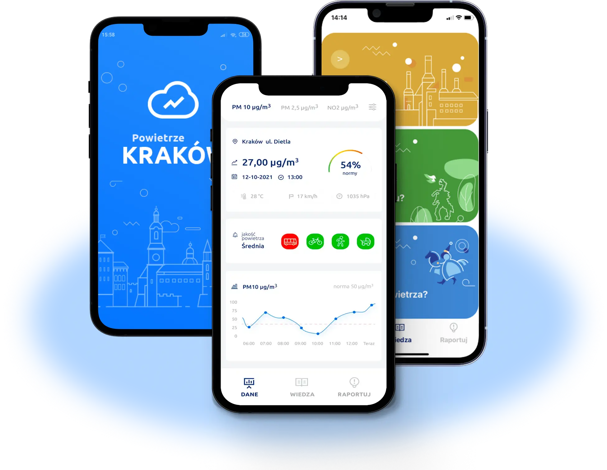 Powietrze Kraków 2.0 to aplikacja mobilna, stworzona z myślą o świadomych użytkownikach pragnących monitorować oraz aktywnie uczestniczyć w poprawie jakości powietrza w Krakowie.